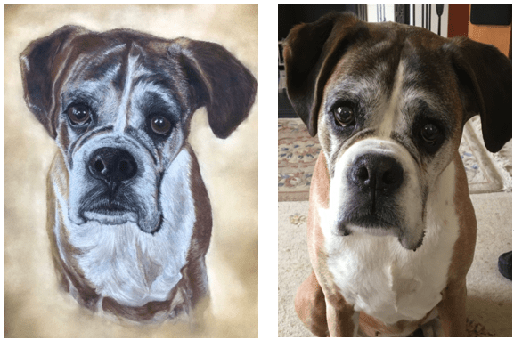 For this portrait of boxer dog, Dusty (2018), I took several photos. In a photo, colouring can vary according to the light so taking a number of photos in different lights helps ensure that the colouring of the animal is true to life as is the case with this portrait of Dusty.