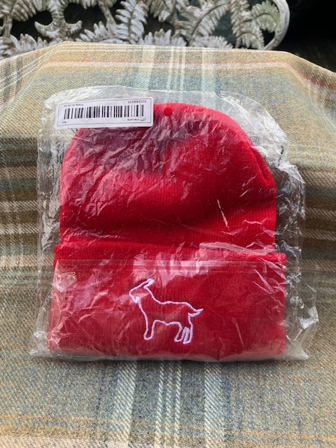 Red knitted beanie hat with goat embroidery. Size child or woman.