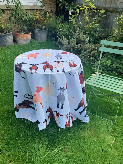 Acrylic printed goats on 60×60 inch square table cloth.