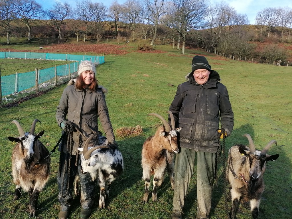 Sharon & Paul with their goats from left to right Jester, Minstral, Bill & Ben.
