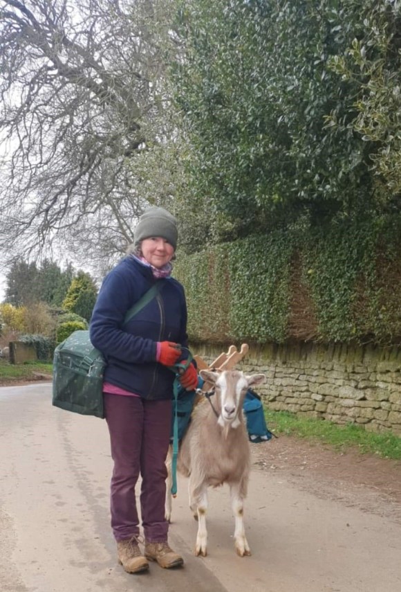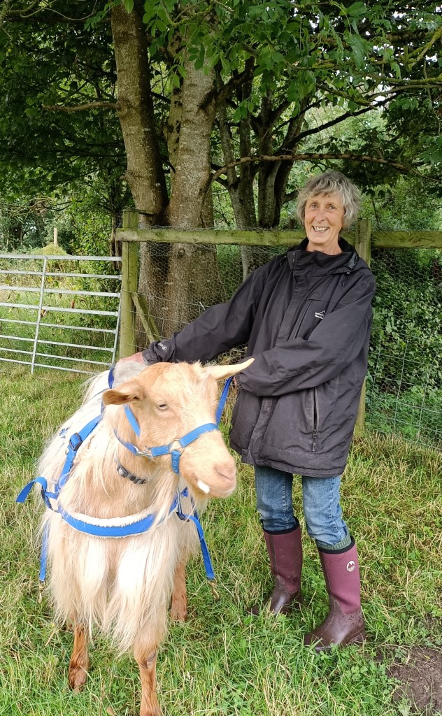 Marie Crawford with her Handsome Golden Guernsey goat Vincent. Marie lives in Wrexham with her three Golden Guernsey goats, three Alpacas and her rescue dog.
