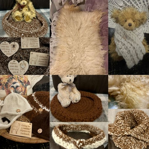All knitted and crocheted items are handmade from Hafod Moor Alpacas.